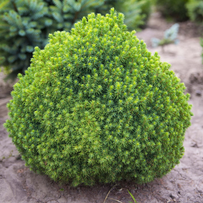 Карликовый округлый хвойный кустарник высотой 0,5-0,8м и диаметром 1м. Медленно растущее.